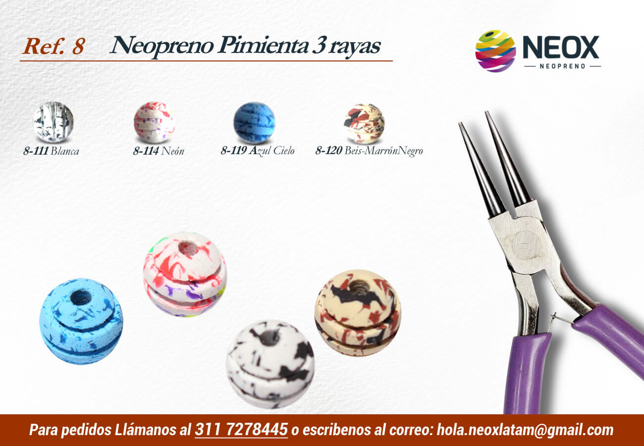 Las bolas de neopreno pimienta con 3 rayas son una excelente opción para joyas estilizadas y elegantes ya que sus sutiles pintas combinadas con diferentes materiales como oro y plata harán de tus joyas una pieza exclusiva.